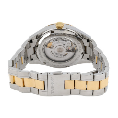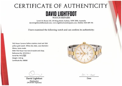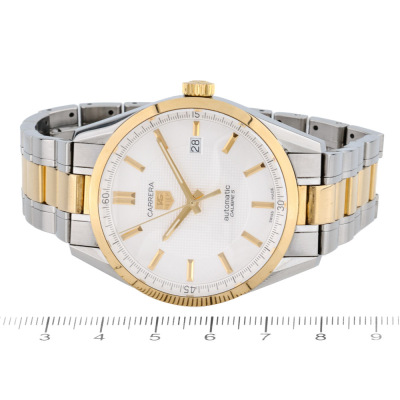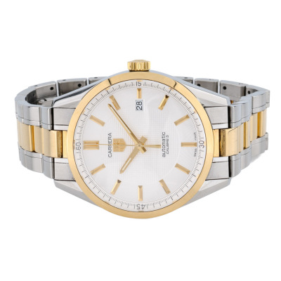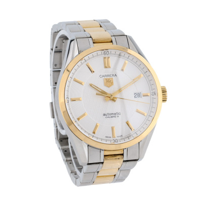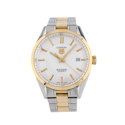 TAG Heuer Carrera Calibre stainless steel and 18ct yellow gold mens watch. White dial, date, case diameter: 39mm, wrist size: 18cm, Swiss made. Ref# WV215A-2. With TAG Heuer two-tone bracelet and clasp. With Certificate of Authenticity. 3 month FSA warranty. Weight: 126.3g. (Pre-owned)