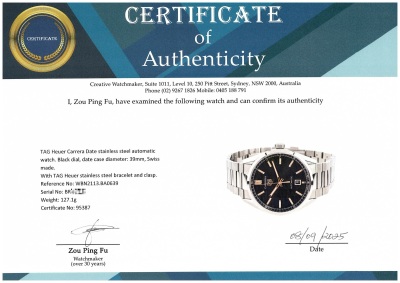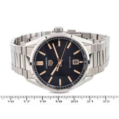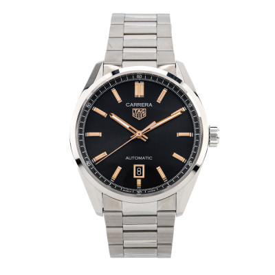 TAG Heuer Carrera Date stainless steel automatic mens watch. Black dial, date case diameter: 39mm, wrist size: 19.5cm, Swiss made. Ref# WBN2113.BA0639. With TAG Heuer stainless steel bracelet and clasp. With Certificate of Authenticity, TAG Heuer International Warranty card dated 14/04/2024 and TAG Heuer box. Balance of 24 months TAG Heuer manufacturer warranty applies. Weight: 127.1g (Pre-owned)