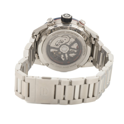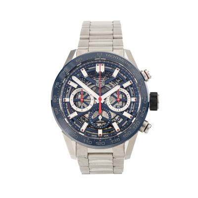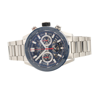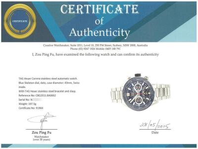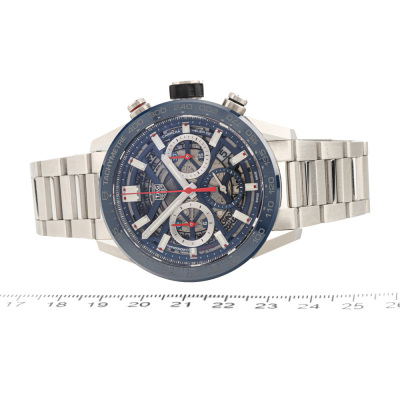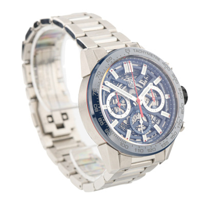 TAG Heuer Carrera stainless steel automatic mens watch. Blue Skeleton dial, date, case diameter: 43mm, wrist size: 20.5cm, Swiss made. Ref# CBG2011.BA0662. With TAG Heuer stainless steel bracelet and clasp. With Certificate of Authenticity, TAG Heuer Limited International Warranty card dated 07/01/2024 and TAG Heuer box. Balance of 2 year TAG Heuer manufacturer warranty applies. (Pre-owned)