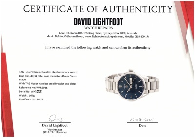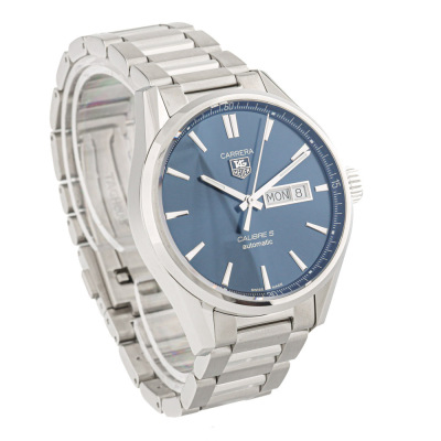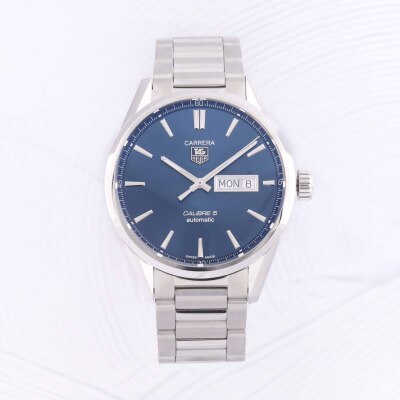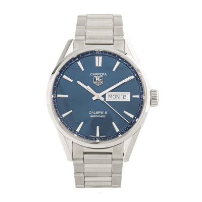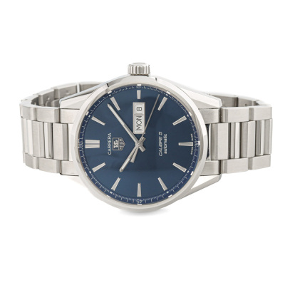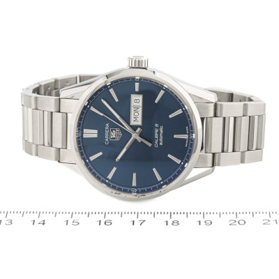 TAG Heuer Carrera stainless steel automatic mens watch. Blue dial, day & date, case diameter: 41mm, max wrist size: 19.5cm, Swiss made. Ref #WAR201E. With TAG Heuer stainless steel bracelet and clasp. With Certificate of Authenticity, TAG Heuer International Warranty card dated 31/01/2018 and TAG Heuer box. 3 month FSA warranty (Pre-owned)