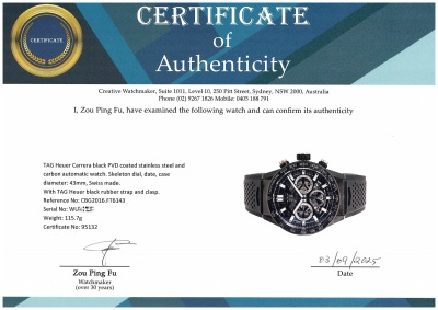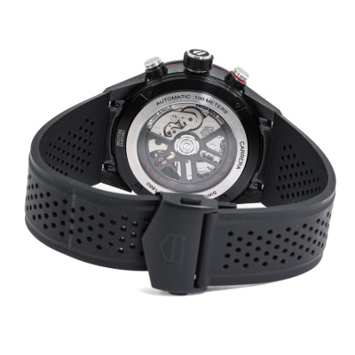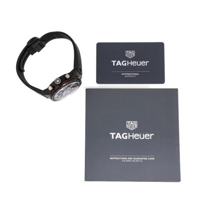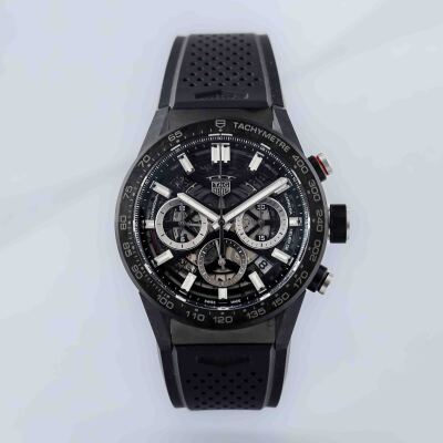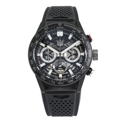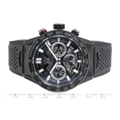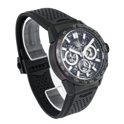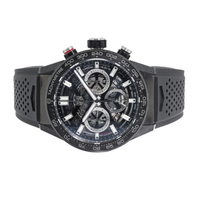 TAG Heuer Carrera black PVD coated stainless steel and carbon automatic mens watch. Skeleton dial, date, case diameter: 43mm, adjustable max wrist size: 21cm, Swiss made. Ref #CBG2016.FT6143. With TAG Heuer black rubber strap and clasp. With Certificate of Authenticity, TAG Heuer International Warranty card dated 31/08/2019 and TAG Heuer box. 3 month FSA warranty. (Pre-owned)