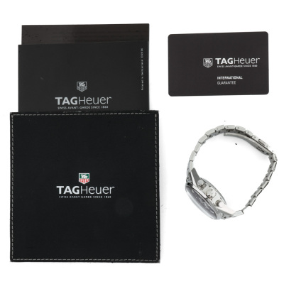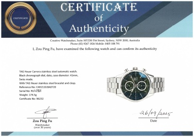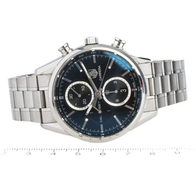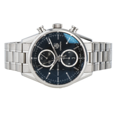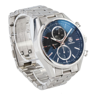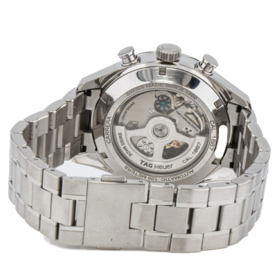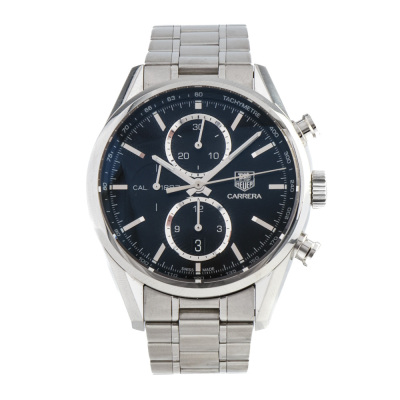TAG Heuer Carrera stainless steel automatic mens watch. Black chronograph dial, date, case diameter: 41mm, wrist size: 19.5cm, Swiss made. Ref# CAR2110.BA0720. With TAG Heuer stainless steel bracelet and clasp. With Certificate of Authenticity, TAG Heuer International Warranty card dated 04/2013 and TAG Heuer box. 3 month FSA warranty. Weight: 174.5g (Pre-owned)