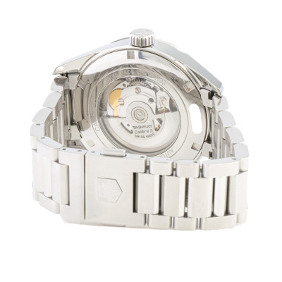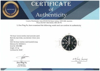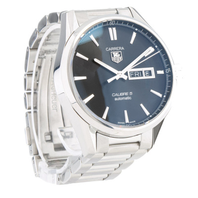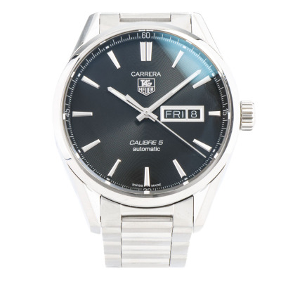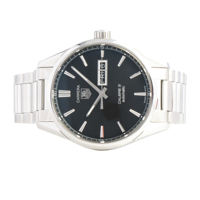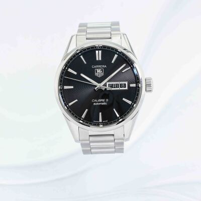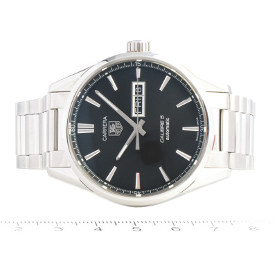 TAG Heuer Carrera stainless steel automatic mens watch. Black dial, day & date, case diameter: 41mm, wrist size: 17cm, Swiss made. Ref# WAR201A-1. With TAG Heuer stainless steel bracelet & clasp. With Certificate of authenticity. 3 month FSA warranty. Weight: 157.2g (Pre-owned)