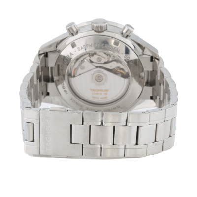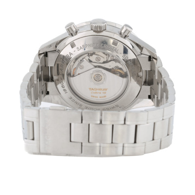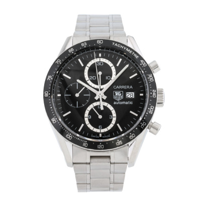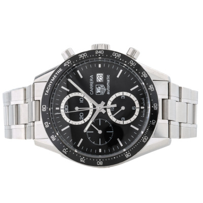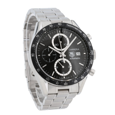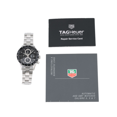 TAG Heuer Carrera stainless steel automatic mens watch. Black chronograph dial, date, case diameter: 41mm, wrist size: 19.5cm, Swiss made. Ref# CV2010. With TAG Heuer stainless steel bracelet and clasp. With Certificate of Authenticity, TAG Heuer Repair Service card dated 09/01/2018 and TAG Heuer box. 3 month FSA warranty. Weight: 164.4g