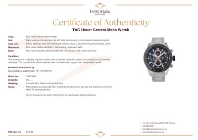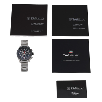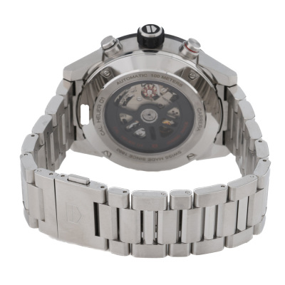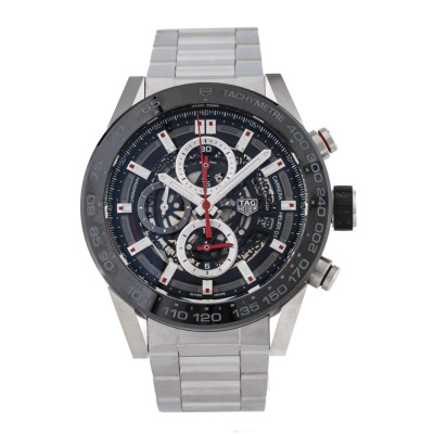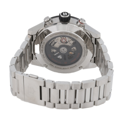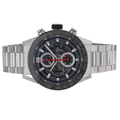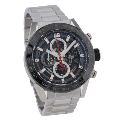 TAG Heuer Carrera stainless steel automatic mens watch. Black Skeleton chronograph dial, date, case diameter: 43mm, wrist size: 20cm, Swiss made. Ref# CAR2A1W.BA0703. With TAG Heuer stainless steel bracelet and clasp. With Certificate of Authenticity, TAG Heuer International Guarantee Card dated 08/08/2016 and TAG Heuer box. 3 month FSA warranty. Weight: 215.8g.