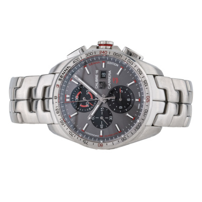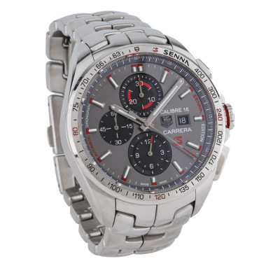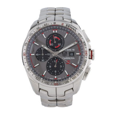 TAG Heuer Carrera Special Edition stainless steel automatic mens watch. Grey chronograph dial, date, case diameter: 44mm, wrist size: 19.5cm, Swiss made. Ref# CBB2010. With TAG Heuer stainless steel bracelet and clasp. With Certificate of Authenticity and TAG Heuer box. 3 month FSA warranty. Weight: 242.3g.