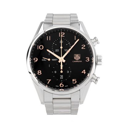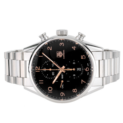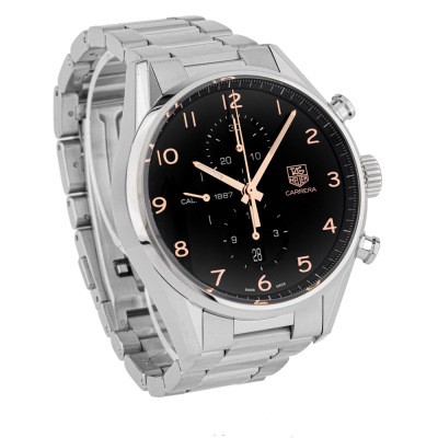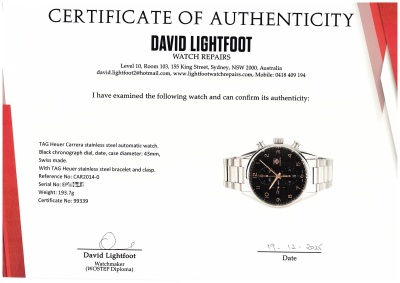 TAG Heuer Carrera stainless steel automatic mens watch. Black chronograph dial, date, case diameter: 43mm, wrist size: 18.5cm, Swiss made. Ref# CAR2014-0. With TAG Heuer stainless steel bracelet and clasp. With Certificate of Authenticity, TAG Heuer International Warranty card dated 23/02/2104, spare TAG Heuer clasp and TAG Heuer box. 3 month FSA warranty. Weight: 193.7g (Pre-owned)