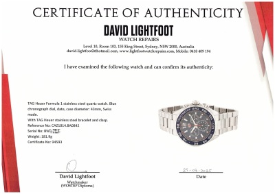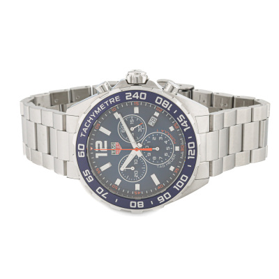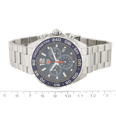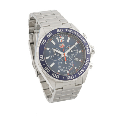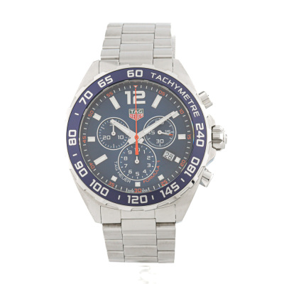 TAG Heuer Formula 1 stainless steel quartz mens watch. Blue chronograph dial, date, case diameter: 43mm, wrist size: 20cm, Swiss made. Ref# CAZ1014.BA0842. With TAG Heuer stainless steel bracelet and clasp. With Certificate of Authenticity, TAG Heuer International Warranty card dated 04/03/2025 and TAG Heuer box. Balance of 24 months TAG Heuer manufacturer warranty applies. (Pre-owned)