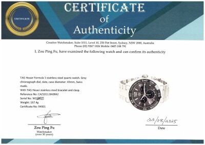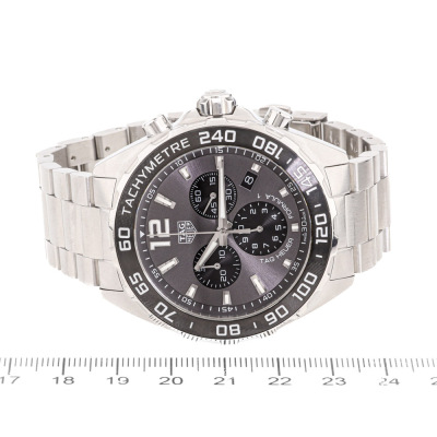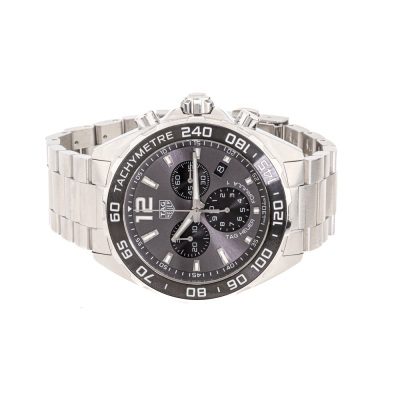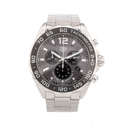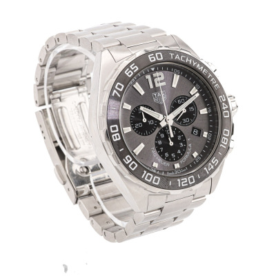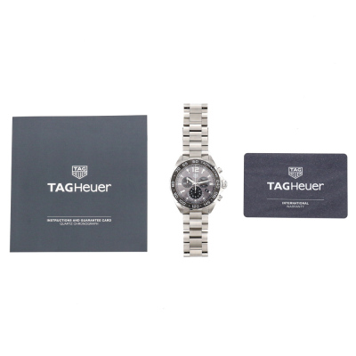 TAG Heuer Formula 1 stainless steel quartz mens watch. Grey chronograph dial, date, case diameter: 43mm, max wrist size: 18cm, Swiss made. Ref# CAZ1011.BA0842. With TAG Heuer stainless steel bracelet and clasp. With Certificate of Authenticity, undated TAG Heuer International Warranty Card and TAG Heuer box. 3 month FSA warranty. (Pre-owned)