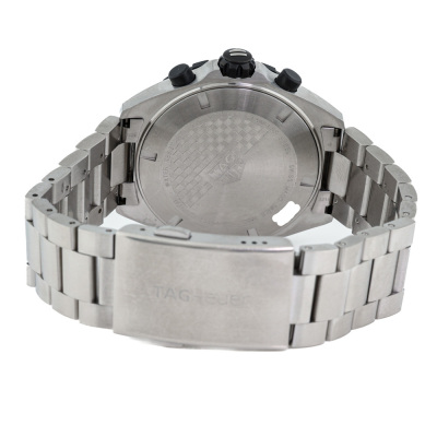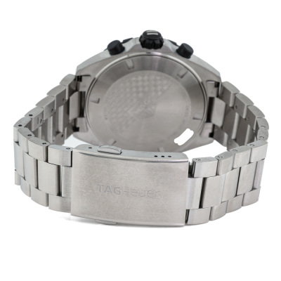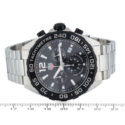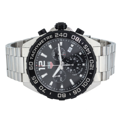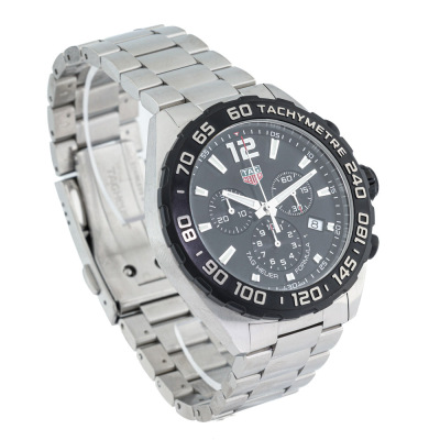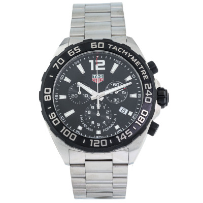 TAG Heuer Formula 1 stainless steel quartz mens watch. Black chronograph dial, date, case diameter: 43mm, wrist size: 20.5cm, Swiss made. Ref# CAZ1010. With TAG Heuer stainless steel bracelet and clasp. With Certificate of Authenticity, Undated TAG Heuer International warranty card and TAG Heuer box. No warranty applies. Weight: 184.4g. (Pre-owned)