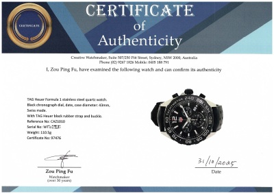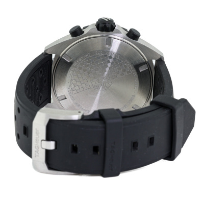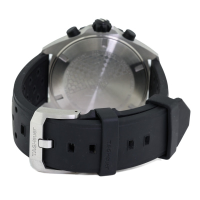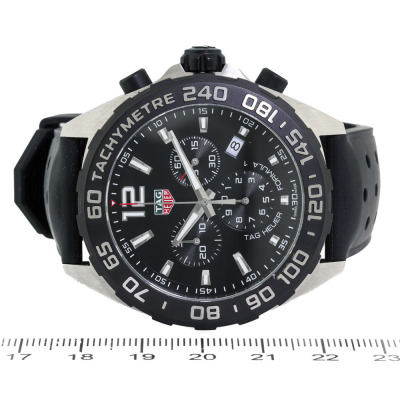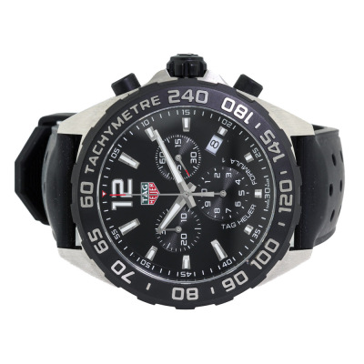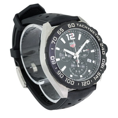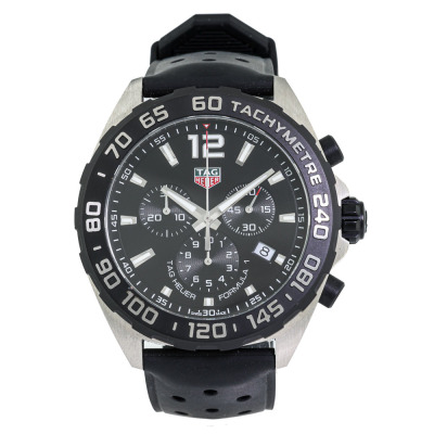 TAG Heuer Formula 1 stainless steel quartz mens watch. Black chronograph dial, date, case diameter: 43mm, max wrist size: 21cm, Swiss made. Ref# CAZ1010. With TAG Heuer black rubber strap and buckle. With Certificate of Authenticity. No warranty applies. Weight: 110.5g (Pre-owned)