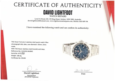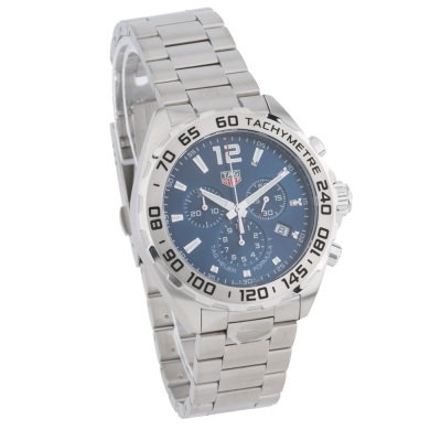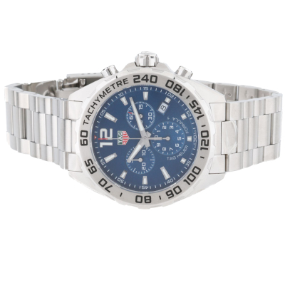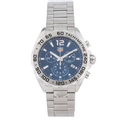 TAG Heuer Formula 1 stainless steel quartz mens watch. Blue chronograph dial, date, case diameter: 43mm, wrist size: 21.5cm, Swiss made. Ref# CAZ101K.BA0842. With TAG Heuer stainless steel bracelet and clasp. With Certificate of Authenticity, TAG Heuer International Warranty card dated 14/03/2024 and TAG Heuer box. Balance of 24 months TAG Heuer manufacturer warranty applies. Weight: 186.4g (Pre-owned)