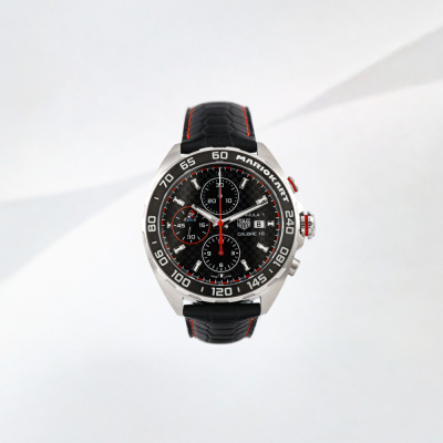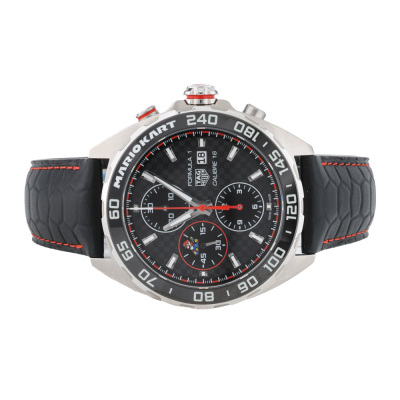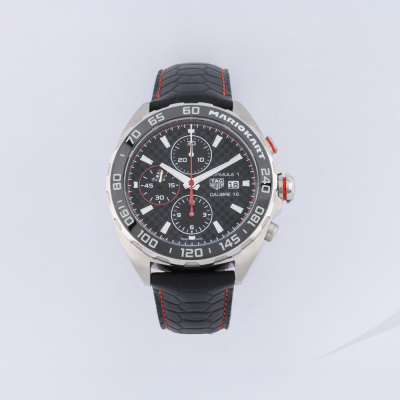 TAG Heuer Formula 1 x Mario Kart Limited Edition stainless steel automatic mens watch. Black chronograph dial, date, case diameter: 44mm, adjustable max wrist size: 20cm, Swiss made. Ref# CAZ201E. With TAG Heuer black leather strap and clasp. With Certificate of Authenticity, undated TAG Heuer International Warranty card and TAG Heuer box. 3 month FSA warranty