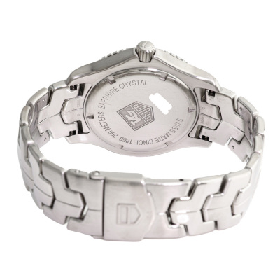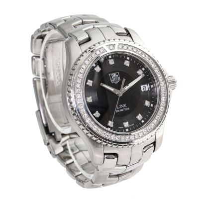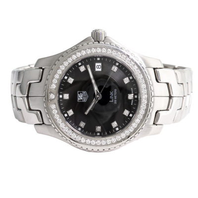 TAG Heuer link stainless steel quartz watch. Black dial, Diamond indicators & set bezel, date, case diameter: 39mm, wrist size: 18cm, Swiss made. Ref# WJ1117. With TAG Heuer stainless steel bracelet and clasp. With Certificate of Authenticity. 3 month FSA warranty