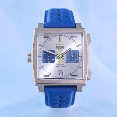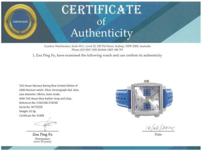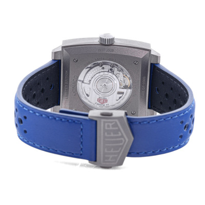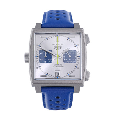 TAG Heuer Monaco Racing Blue Limited Edition of 1000 titanium mens watch. Silver chronograph dial, date, case diameter: 39mm, adjustable wrist size: 18cm, Swiss made. Ref# CAW218C.FC6548. With TAG Heuer blue leather strap and clasp. With Certificate of Authenticity, TAG Heuer purchase receipt dated 31/07/2023, TAG Heuer Limited International Warranty card dated 31/07/2023 and TAG Heuer box. Balance of 2 year TAG Heuer manufacturer warranty applies. (Pre-owned)