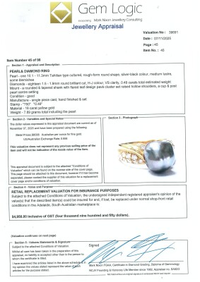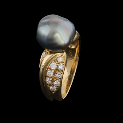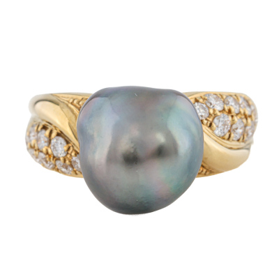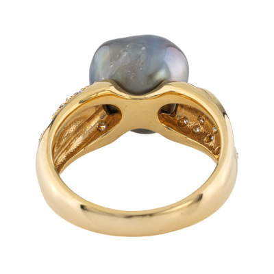 Pearl and Diamond ring with Baroque Tahitian Pearl of 10.1 x 11.3mm and round Natural Diamonds totalling 0.49ct (Gem Logic Valuation Certificate graded as H-J VS. FSA estimated grading: G-H VS-SI). 18ct yellow gold. Ring size: L1/4. Band width: 3.3mm - 5.3mm. Weight: 7.9g. With Valuation Certificate dated 07/11/2025. (Pre-owned)