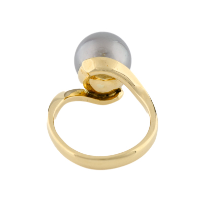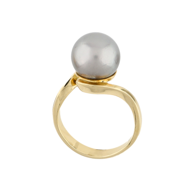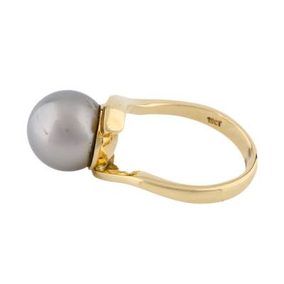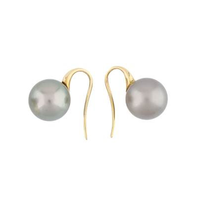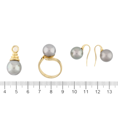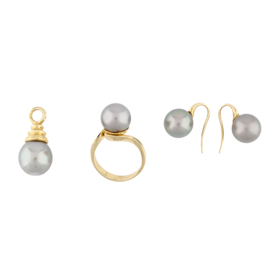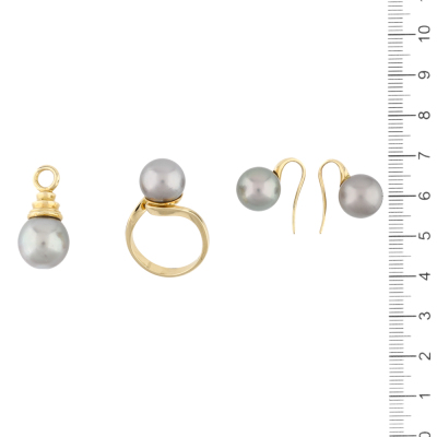 Pearl Earring, Ring & Pendant Set. 1) Shepherds hook earrings with Tahitian Pearls of 11.0mm. Drop length: 1.7cm. 2) Pearl ring with a Tahitian Pearl of 11.1mm. Ring size N1/4. Band width: 3.2mm - 2.0mm. 3) Pearl pendant with a Tahitian Pearl of 12.7mm. No chain provided. All in 18ct yellow gold. Total weight: 18.1g.