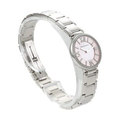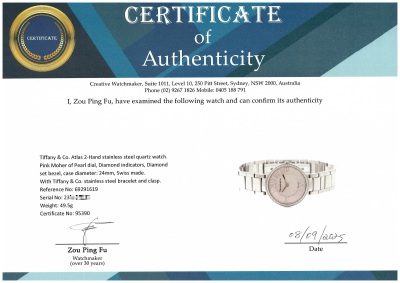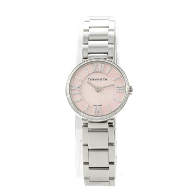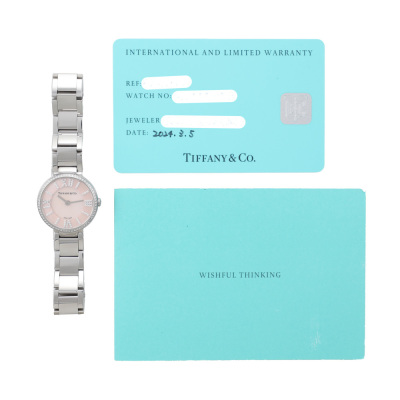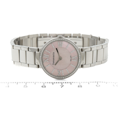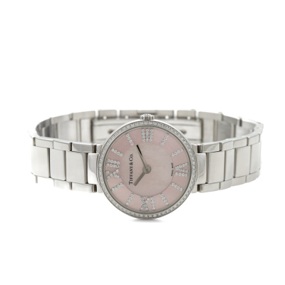 Tiffany & Co. Atlas 2-Hand stainless steel quartz ladies watch. Pink Moher of Pearl dial, Diamond indicators, Diamond set bezel, case diameter: 24mm, wrist size: 18.5cm, Swiss made. Ref# 69291619. With Tiffany & Co. stainless steel bracelet and clasp. With Certificate of Authenticity, Tiffany & Co. International & Limited Warranty card dated 05/03/2024 and Tiffany & Co. box. Balance of 2 year Tiffany & Co. manufacturer warranty applies. (Pre-owned)
