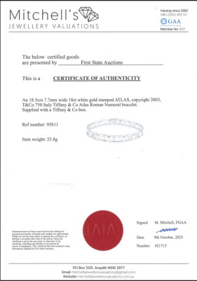 Tiffany & Co Atlas Roman Numeral bracelet. 18ct white gold. Length: 18.5cm. Width: 7.7mm. Circa 2003. Made in Italy. Weight: 23.8g. With Tiffany & Co box. With Valuation Certificate #421713. (Pre-owned)