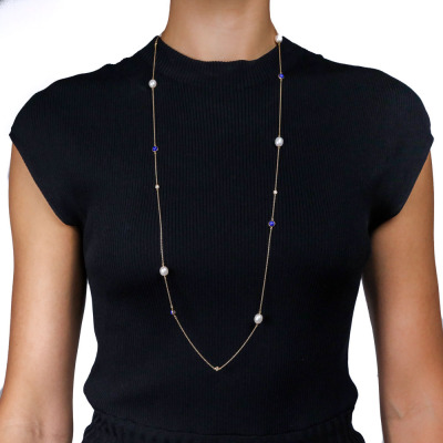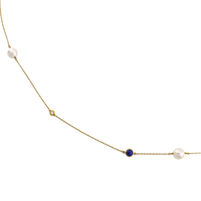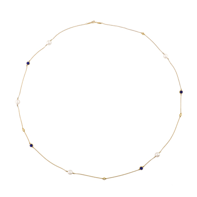 Tiffany & Co. Elsa Peretti Colour By The Yard Sprinkle Necklace with 4 round Natural Diamonds totalling approximately 0.28ct, 5 oval shape Freshwater Pearls from 7.8mm - 7.4mm and 4 round cabochon cut Natural Lapis Lazuli of size 5.0mm. 18ct yellow gold with Tiffany & Co. 18ct yellow gold chain. Length: 92cm. Made in Spain. Weight: 11.0g. With Certificate #1899281924667077. (Pre-owned)
