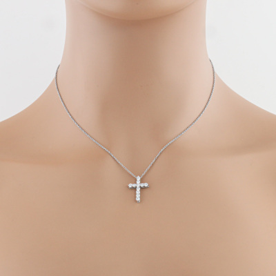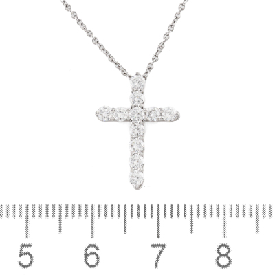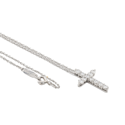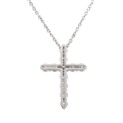 Tiffany & Co Cross Pendant, size small with 11 round Natural Diamonds totalling approximately 0.42ct (Estimated grading: F-G VS). Cross motif size: 1.8cm x 1.3cm. Platinum - 950 with 40cm Tiffany & Co Platinum - 950 chain. Weight: 3.8g. With Tiffany & Co purchase card dated 12/1997 and Tiffany & Co. box. (Pre-owned)