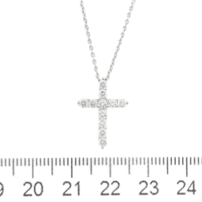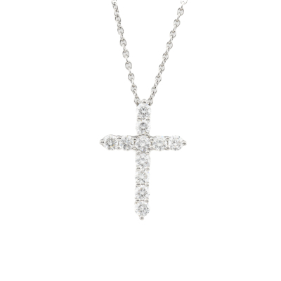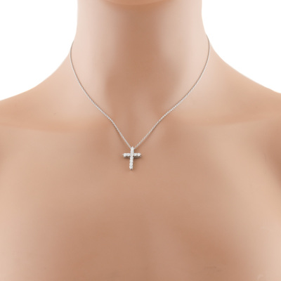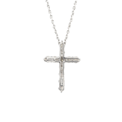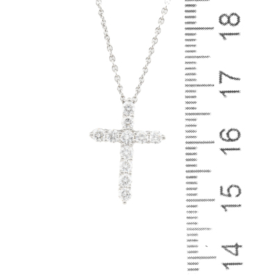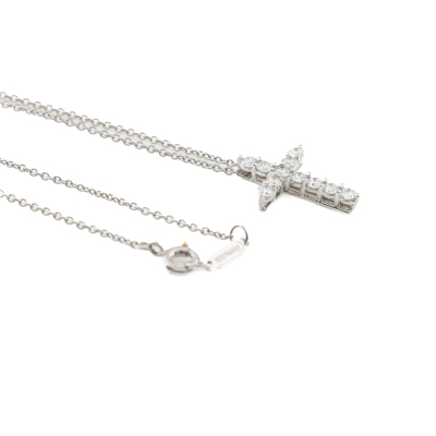 Tiffany & Co Cross pendant, size small with 11 round Natural Diamonds totalling approximately 0.42ct (Estimated grading: F-G VS). Cross motif size: 1.8cm x 1.2cm. Platinum - 950 with 42cm Tiffany & Co Platinum - 950 chain. Weight: 4.4g. (Pre-owned)