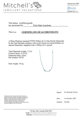 Tiffany & Co. Elsa Peretti Diamonds By The Yard Sprinkle Necklace with 12 round Natural Diamonds totalling approximately 1.20ct (Estimated grading: F-G VS). Platinum 950. Length: 90cm. Weight: 10.3g. With Tiffany & Co. pouch. With Certificate #421636. (Pre-owned)