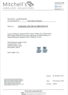 Tiffany & Co. Elsa Peretti Bean design earrings with round Natural Diamonds totalling approximately 0.25ct. Platinum. Made in Spain. Weight: 4.1g. With Tiffany & Co. box. With Certificate #420022. (Pre-owned)