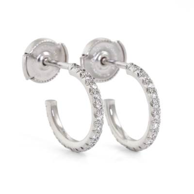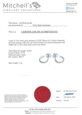 Tiffany & Co metro hoop earrings with round Natural Diamonds totalling 0.30cts (Estimated grading: F VS). 18ct white gold with tiffany & Co. 18ct white gold secure lock backs. Weight: 3.1g. With Certificate 420140. (Pre-owned)