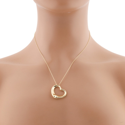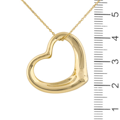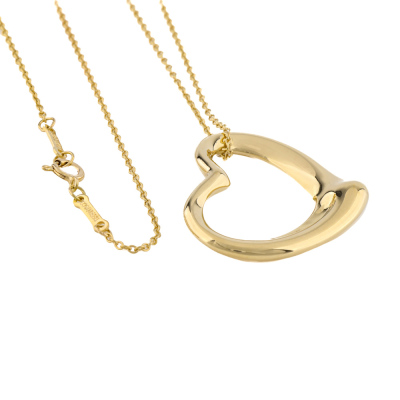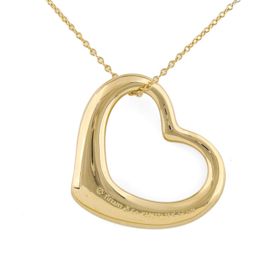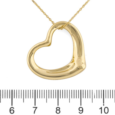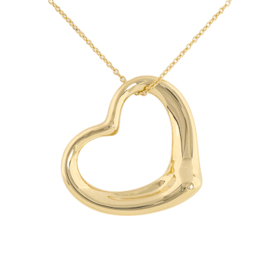 Tiffany & Co. Elsa Peretti Open Heart pendant. Motif size: 27mm x 25mm. 18ct yellow gold with Tiffiany & Co. 18ct yellow gold chain. Made in Spain. Length: 46cm. With Tiffany & Co box & purchase card dated December 1996.