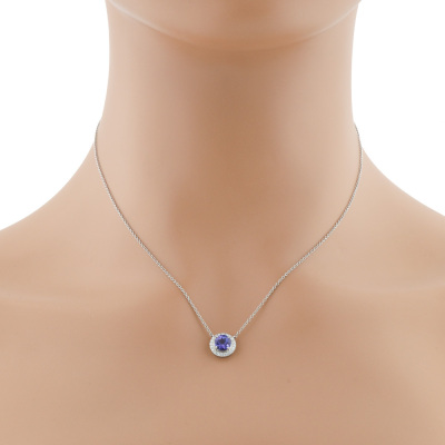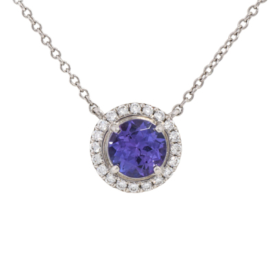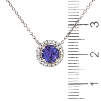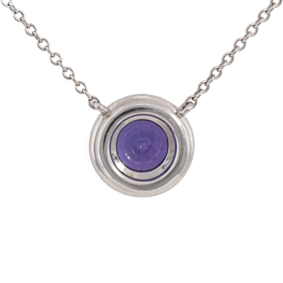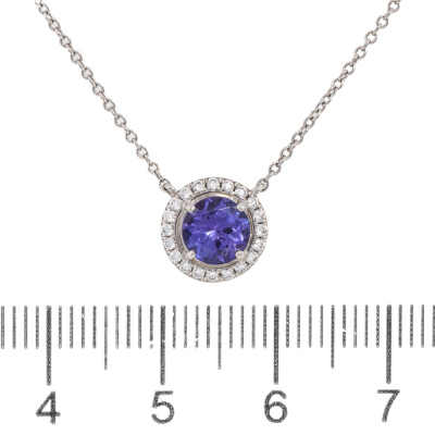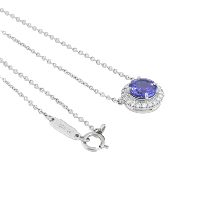 Tiffany & Co Soleste Tanzanite and Diamond pendant with a round shape Natural Tanzanite of approximately 0.75ct and round Natural Diamonds totalling approximately 0.09ct. Platinum 950 with attached Tiffany & Co chain. Length: 41cm. Weight: 3.9g. With Tiffany & Co. box. (Pre-owned)