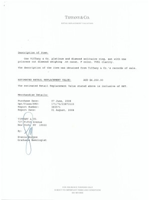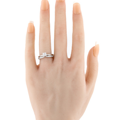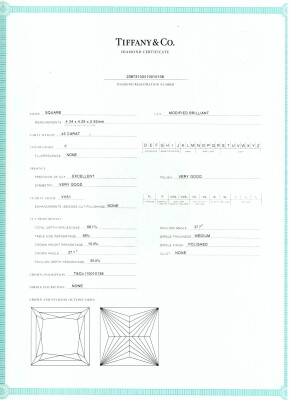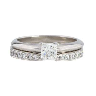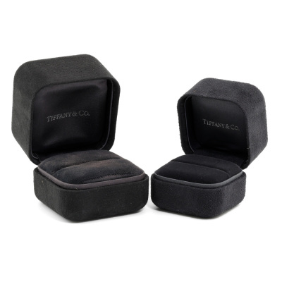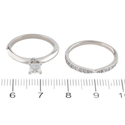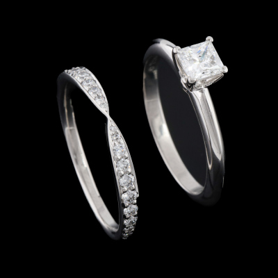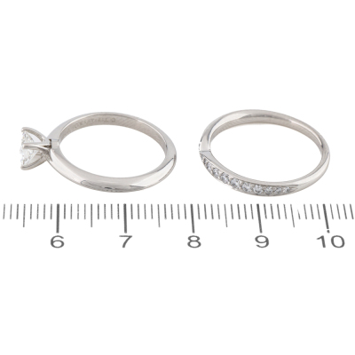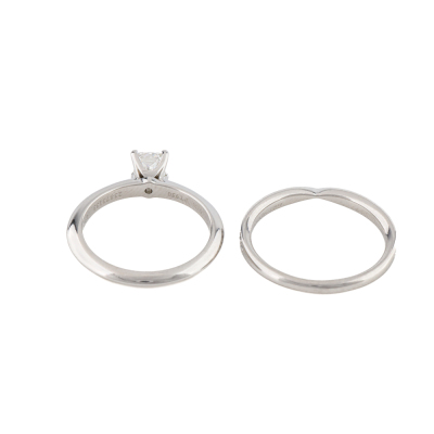 Set of 2 rings. 1) Tiffany & Co. Diamond solitaire ring with a princess cut Natural Diamond of 0.45ct (with Tiffany & Co. Diamond Certificate graded as F VVS1 #23873133). Platinum - 950. Band width: 2.0mm-2.3mm. With Tiffany & Co. Valuation dated 07/06/08 and purchase receipt dated 07/06/08. 2) Tiffany & Co. Harmony Band Ring with round Natural Diamonds totalling 0.23ct. Platinum - 950. Band width: 1.8mm. With Tiffany & Co. box.