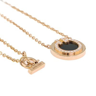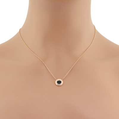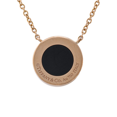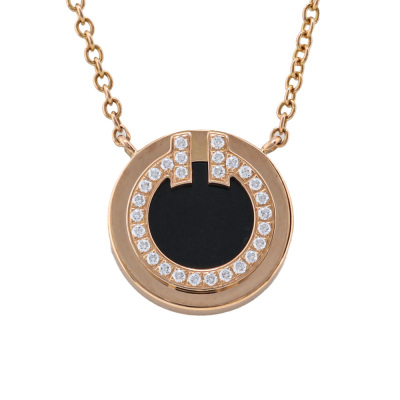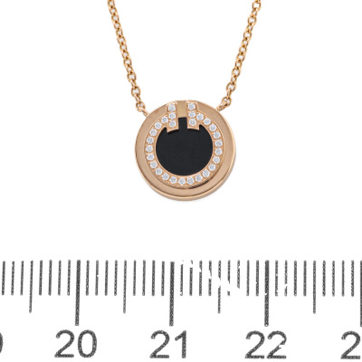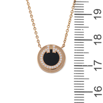 Tiffany & Co. T Diamond and Onyx Circle pendant with round Natural Diamonds totalling 0.03ct and round Natural Onyx inlay. Motif diameter 10.8mm. 18ct rose gold with attached Tiffany & Co. 18ct rose gold adjustable chain. Length: 45cm. Made in Italy. Weight: 3.4g. (Pre-owned)