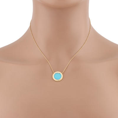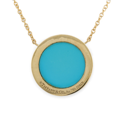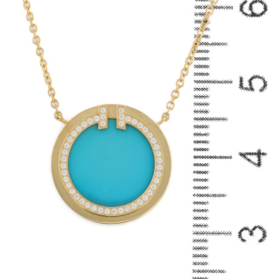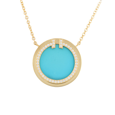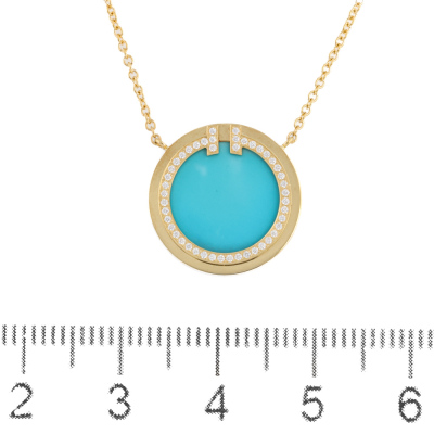 Tiffany & Co. T Circle pendant with Turquoise inlay and round Natural Diamonds totalling 0.05ct. Motif diameter 16mm. 18ct yellow gold with Tiffany & Co. 18ct yellow gold attached chain. Adjustable length: 41cm - 46cm. Made in Italy. Weight: 4.5g. With Tiffany & Co. box. (Pre-owned)