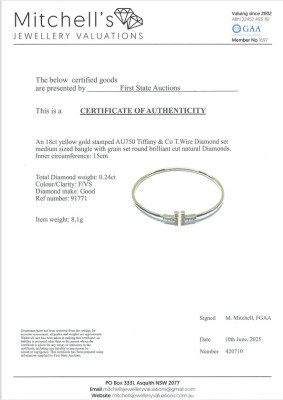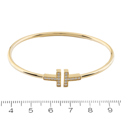 Tiffany & Co. T Wire bracelet, medium size with round Natural Diamonds totalling 0.24ct. 18ct yellow gold. Inner circumference approximately 15cm. Weight: 8.1g. With Certificate #420710. (Pre-owned)