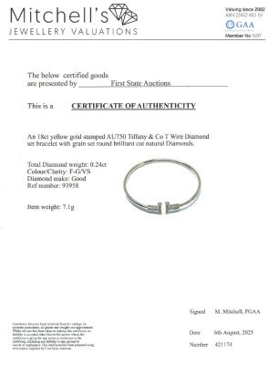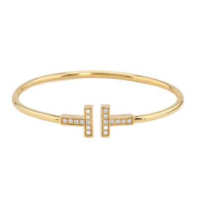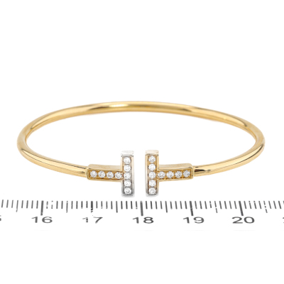 Tiffany & Co. T Wire bracelet, medium size with round Natural Diamonds totalling approx. 0.24ct. 18ct yellow gold. Inner circumference approximately 15cm. Width: 2.4mm. Weight: 7.1g. With Certificate #421174. (Pre-owned)