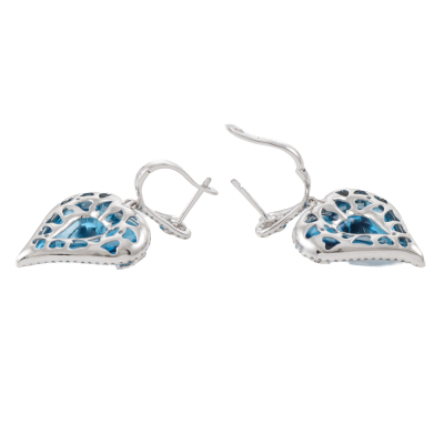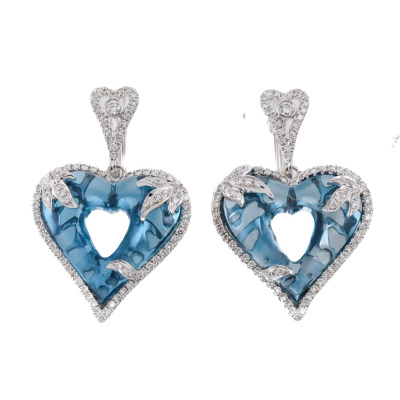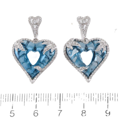 Topaz and Diamond earrings with carved open-heart shape Natural Blue Topaz of size 16.8 x 15mm and round natural Diamonds totalling 0.89ct (Estimated grading: H-I SI). 18ct white gold. Weight: 8.5g. (pre-owned)