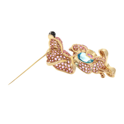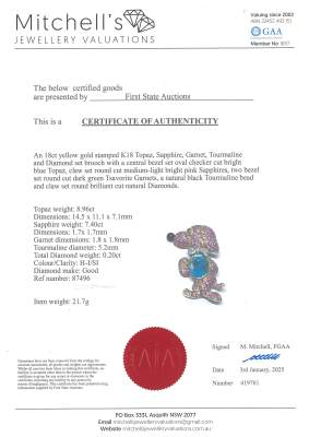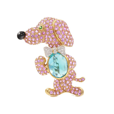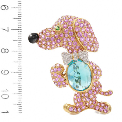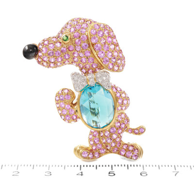 Topaz, Sapphire and Diamond dog brooch/pendant with oval shape Natural Blue Topaz of 8.96ct, round Pink Natural Sapphires of 7.40ct, round green Natural Tsavorite Garnet of approximately 1.8mm, round Natural black Tourmaline of diameter 5.2mm and round Natural Diamonds totalling 0.20ct. 18ct yellow gold. Dimensions approximately: 5.0cm x 3.3cm. Weight: 21.7g. With Certificate #419761. (Pre-owned)