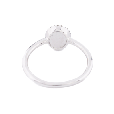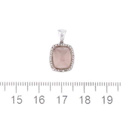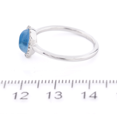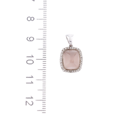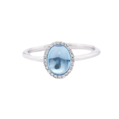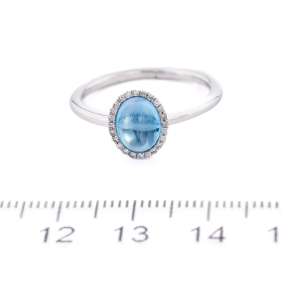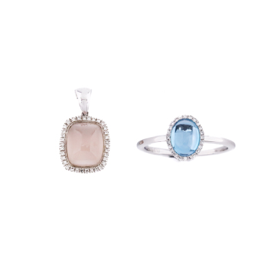 Ring and pendant set. 1) Topaz and Diamond ring with oval cabochon cut Natural Blue Topaz of approximately 1.79ct and round Natural Diamonds totalling 0.10ct. Ring size P1/2. 2) Quartz and Diamond pendant with oval cabochon cut Natural Rose Quartz of approximately 3.34ct and round Natural Diamonds totalling 0.10ct. No chain provided. All 9ct white gold. Combined weight: 5.0g (As New)**