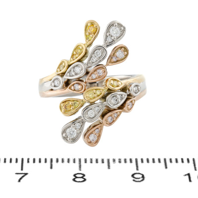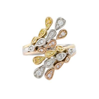 Tri-colour Diamond hinged ring with round Natural white, Fancy Yellow and Light Purplish Pink Diamonds totalling 0.20ct. Platinum - 950, 18ct yellow & rose gold. Ring size: K1/2. Band width: 3.5.mm. Weight: 10.6g. (Pre-owned)