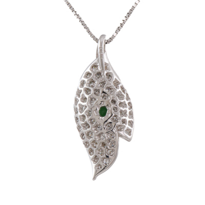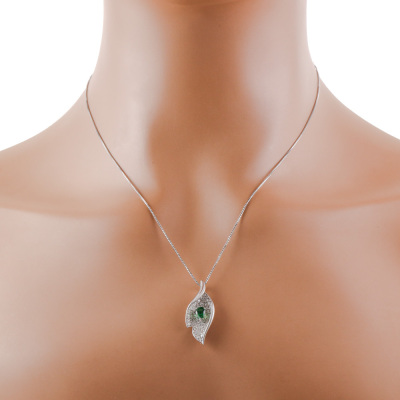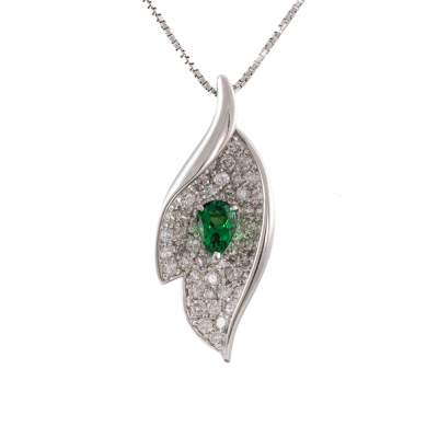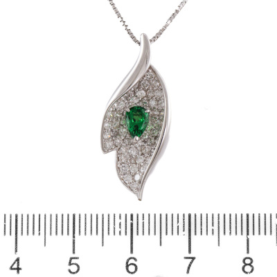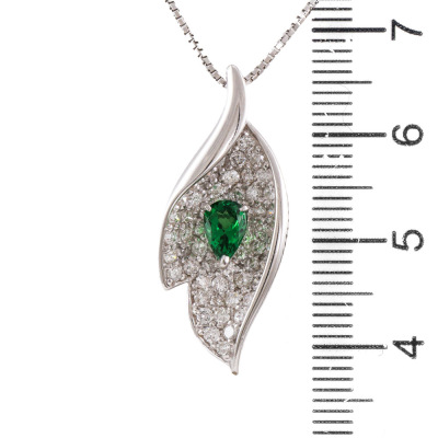 Tsavorite and Diamond pendant with centre pear shape Natural Tsavorite Garnet of 0.40ct and round Natural Diamonds totalling 0.81ct (Estimated grading: G SI). 18ct white gold with 45cm adjustable 18ct white gold chain. Weight: 5.7g. (Pre-owned)