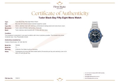 Tudor Black Bay Fifty-Eight stainless steel automatic mens watch. Blue dial, case diameter: 39mm, wrist size: 20cm, Swiss made. Ref# 79030B. With Tudor stainless steel bracelet and clasp. With Certificate of Authenticity, Tudor International Guarantee dated 04/10/2024 and Tudor box. Balance of 5 year Tudor manufacturer warranty applies.
