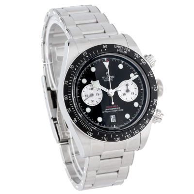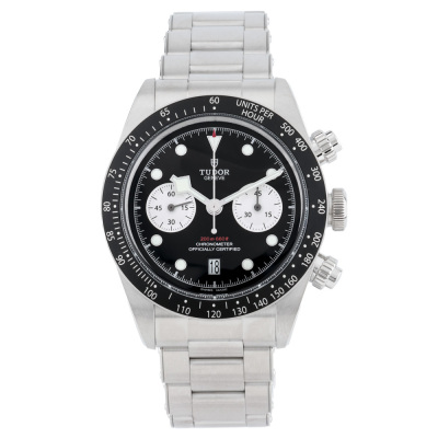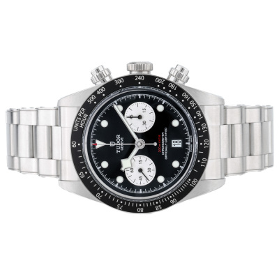 Tudor Black Bay stainless steel automatic mens watch. Black chronograph dial, date, case diameter: 41mm, wrist size: 19.5cm, Swiss made. Ref# 79360N. With Tudor stainless steel bracelet and clasp. With Certificate of Authenticity, Tudor International Guarantee card dated 03/07/2022 and Tudor box. Balance of 5 years Tudor manufacturer warranty applies. Weight: 185.7g.