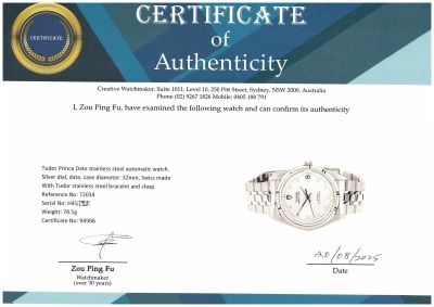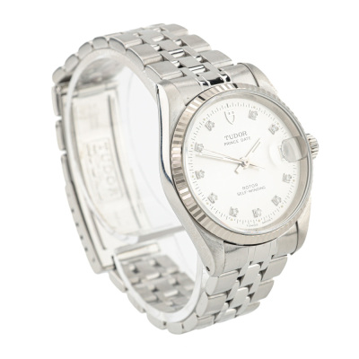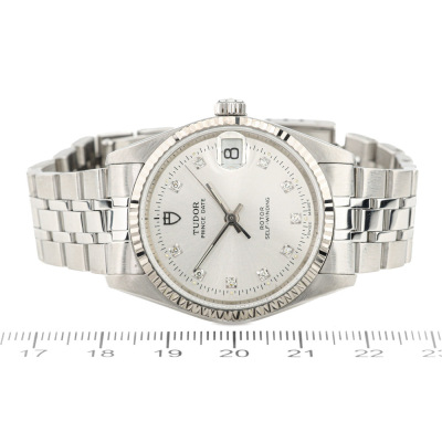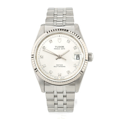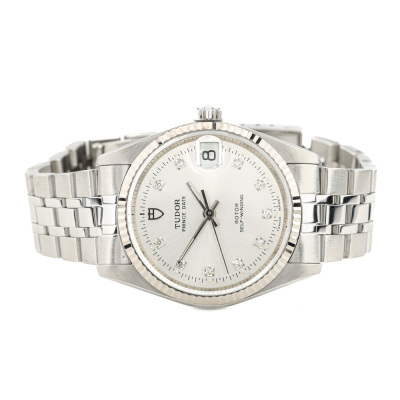 Tudor Prince Date stainless steel automatic watch. Silver dial, date, case diameter: 32mm, max wrist size: 17.5cm, Swiss made. Ref# 72034. With Tudor stainless steel bracelet and clasp. With Certificate of Authenticity. 3 month FSA warranty. (Pre-owned)