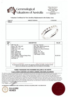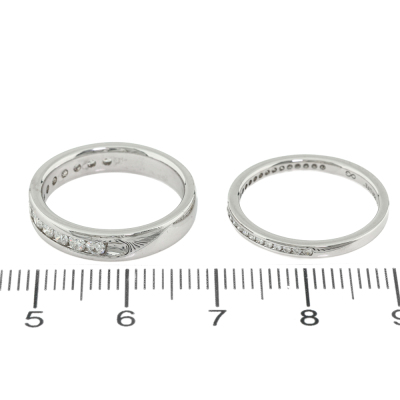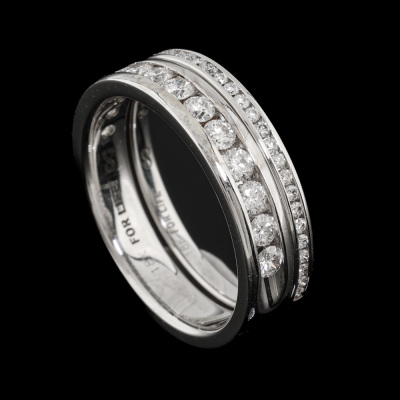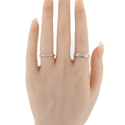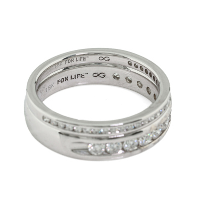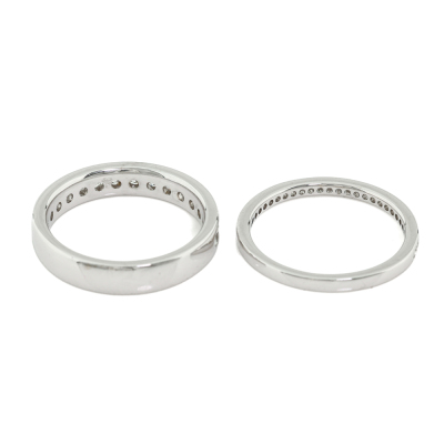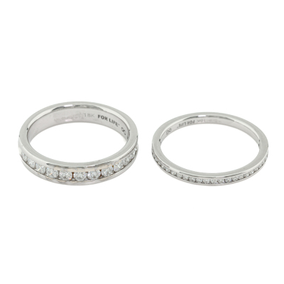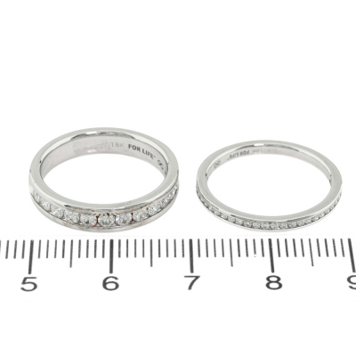 Two Diamond eternity ring Set. 1) Diamond eternity ring with 28 round Natural Diamonds totalling approximately 0.14ct. 18ct white gold. Ring size J3/4. Band width: 1.8mm. 2) Diamond eternity ring with 13 round Natural Diamonds totalling approximately 0.52ct (Estimated grading: G-H VS-SI). Ring size J3/4. Band width: 3.7mm. Both 18ct white gold. With engraving 'For Life'. Total Both with Valuations dated 01/02/26. Weight: 5.8g