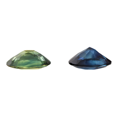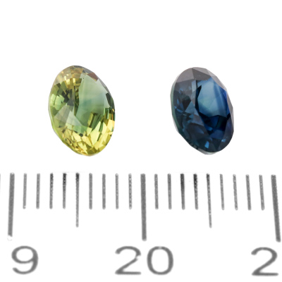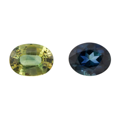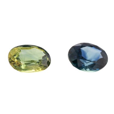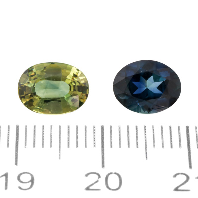 Two loose oval shape Natural Sapphires totalling 3.10ct. 1) Dark blue Sapphire of 1.61ct. Size: 8.1mm x 6.4mm x 4.0mm. 2) Yellowish green Sapphire of 1.49ct. Size: 8.4mm x 6.2mm x 3.4mm.