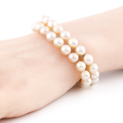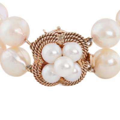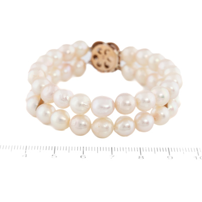 Two row Pearl bracelet with 42 Cultured Pearls of 7.5mm. 14ct rose gold clasp with 5 round Akoya Pearl of 1.5mm. Length: 18.5cm. Weight: 30.8g. (Pre-owned)