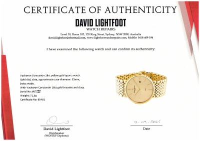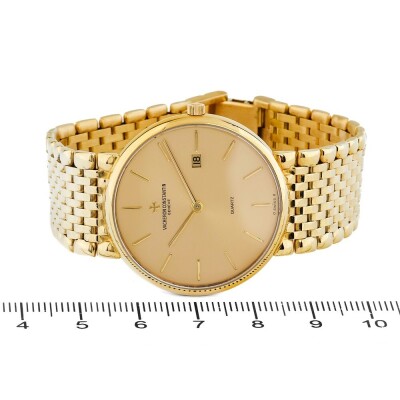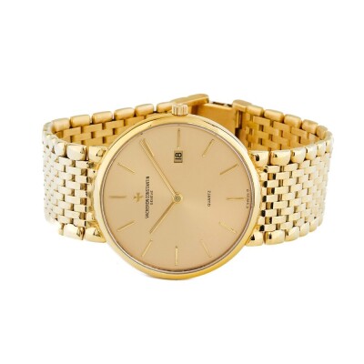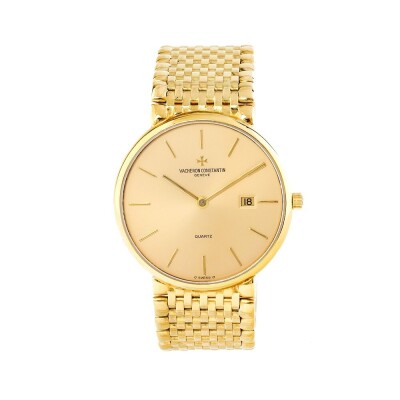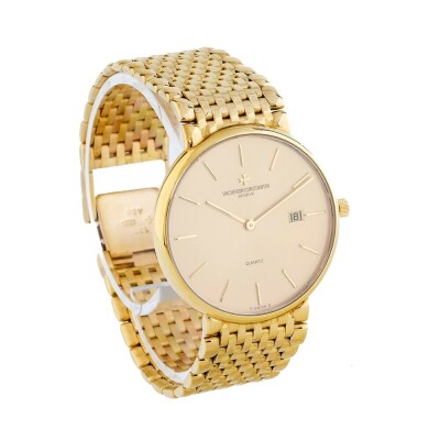 Vacheron Constantin 18ct yellow gold quartz watch. Gold dial, date, approximate case diameter: 32mm, wrist size: 15.5cm, Swiss made. With Vacheron Constantin 18ct gold bracelet and clasp. With Certificate of Authenticity. 3 month FSA warranty. (Pre-owned)
