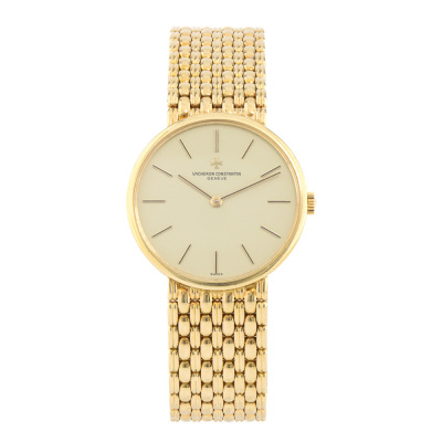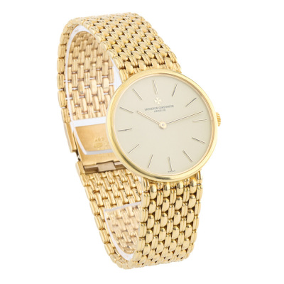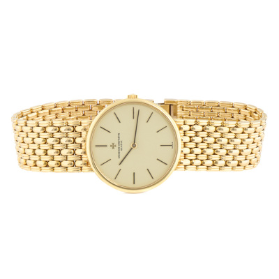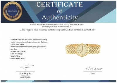 Vacheron Constantin 18ct yellow gold manual winding watch. Cream colour dial, approximate case diameter: 31mm, wrist size: 19cm, Swiss made. Ref# 39015-1. With Vacheron Constantin 18ct yellow gold bracelet and clasp. With Certificate of Authenticity. 3 month FSA warranty. Weight: 78.3g (Pre-owned)
