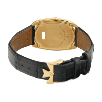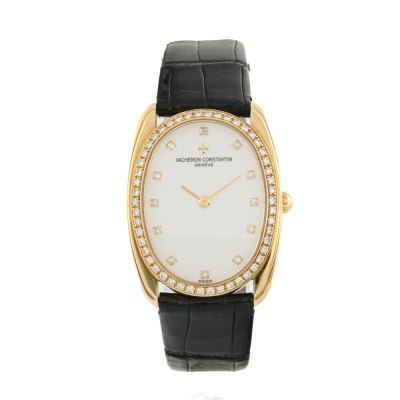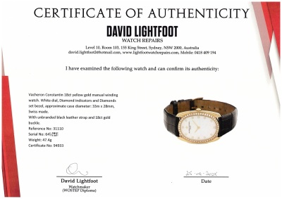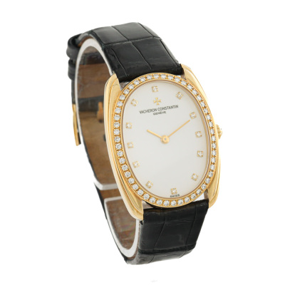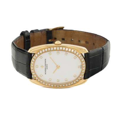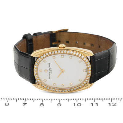 Vacheron Constantin 18ct yellow gold manual winding ladies watch. White dial, Diamond indicators and Diamonds set bezel, approximate case diameter: 33m x 28mm, max wrist size: 18cm, Swiss made. Ref# 31110. With unbranded black leather strap and 18ct gold buckle. With Certificate of Authenticity. No warranty applies (Pre-owned)